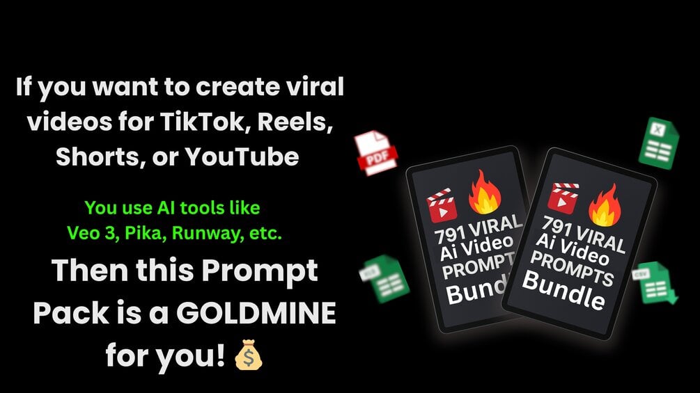 You’ll get 791 ready-to-use video prompts for TikTok, Reels, Shorts, and YouTube. Each prompt includes a unique video idea, sound/music suggestion, Veo TTS-ready voiceover script, and a short-form script – all in PDF + Google Sheet format.