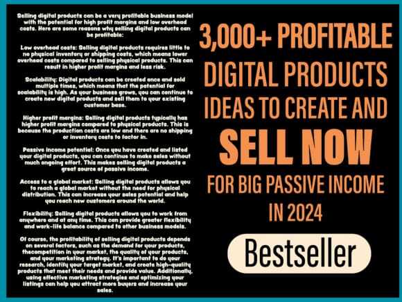 you can make tons of tons sales from those product ideas and you can sell them on all sites, Of course, the profitability of selling digital products depends on several factors, such as the demand for your products, the competition in your market, the quality of your products, and your marketing strategy. It’s important to do your research, identify your target market, and create high-quality products that meet their needs and provide value. Additionally, using effective marketing strategies and optimizing your listings can help you attract more buyers and increase your sales.
