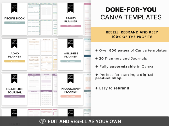 Launch or grow your digital product business instantly with this bundle of 20 editable journals and planners across trending niches. With 800+ fully customizable Canva pages, you can edit, rebrand, and resell these products as your own—keeping 100% of the profits!