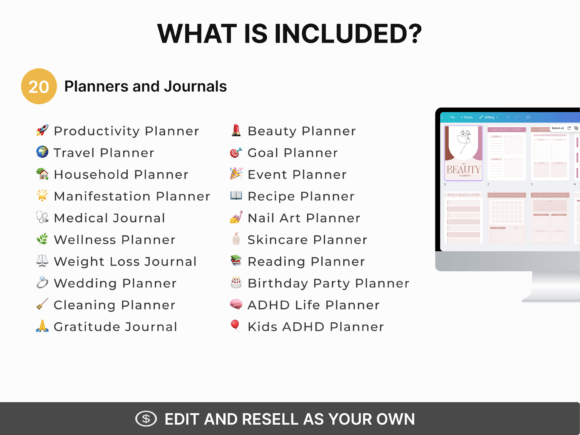 You’ll receive 20 customizable planners & journals covering top-selling niches: